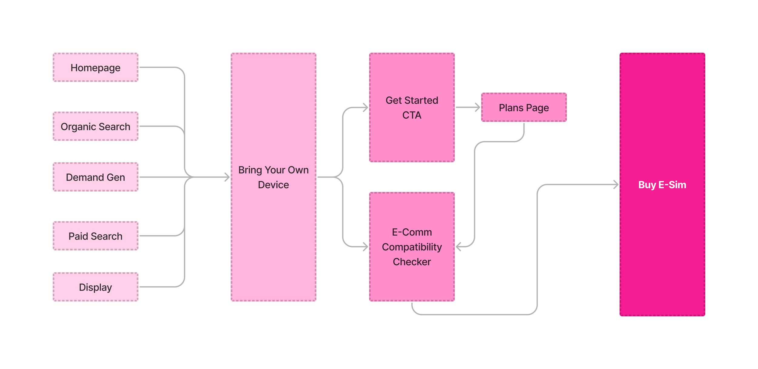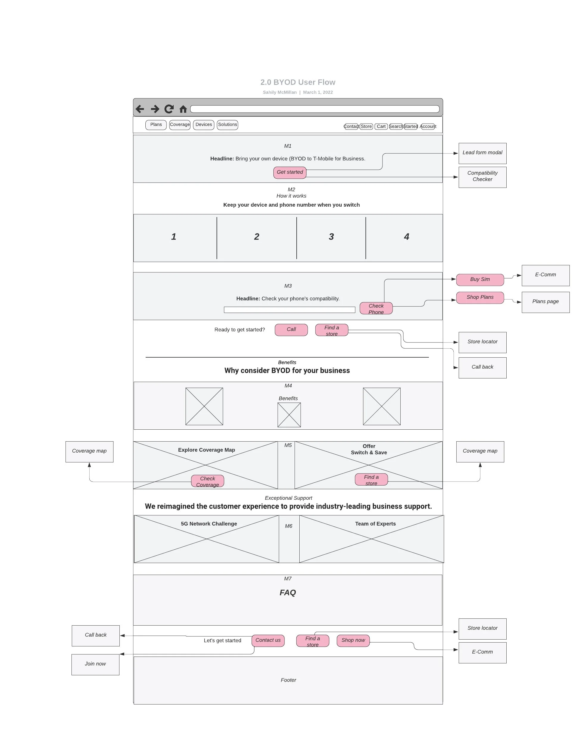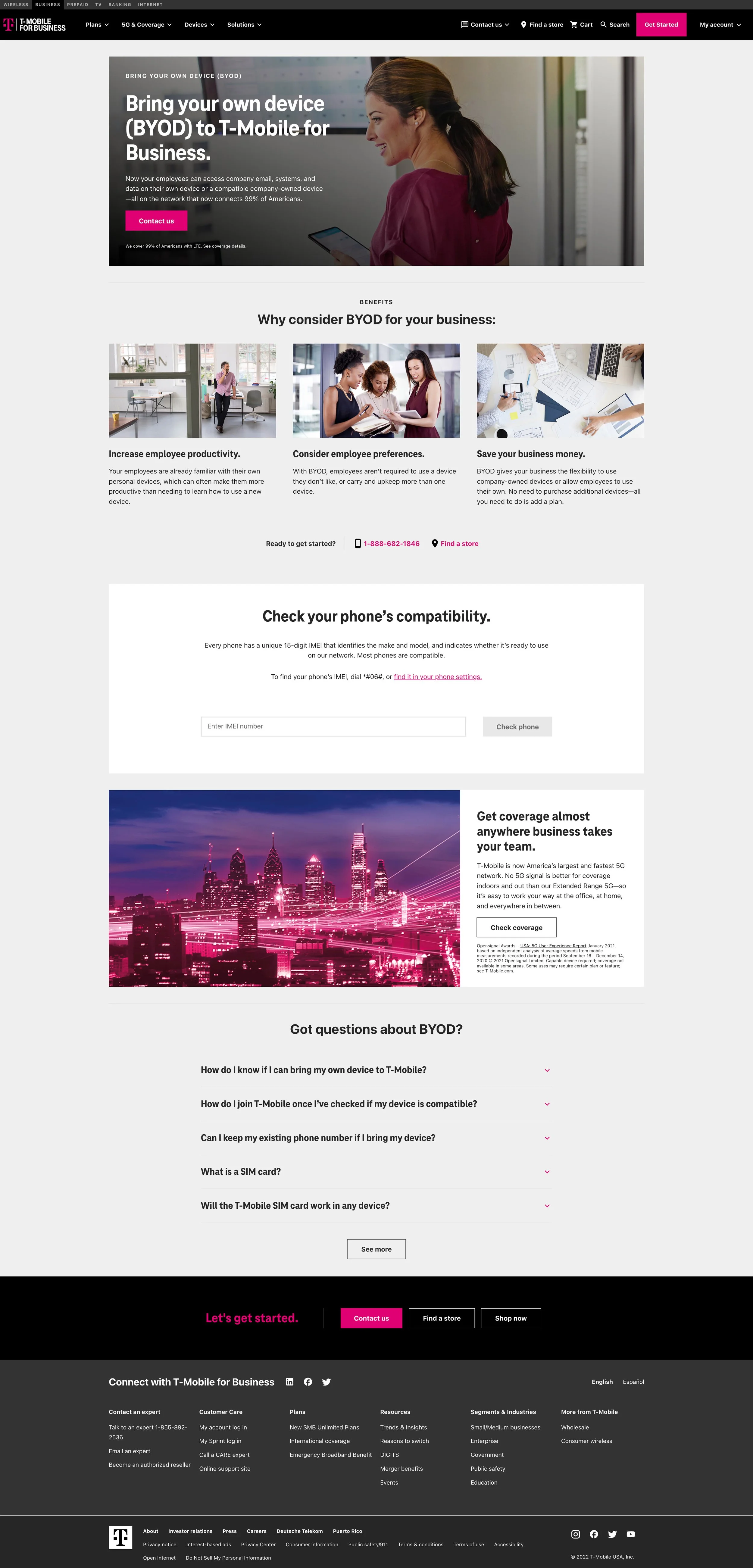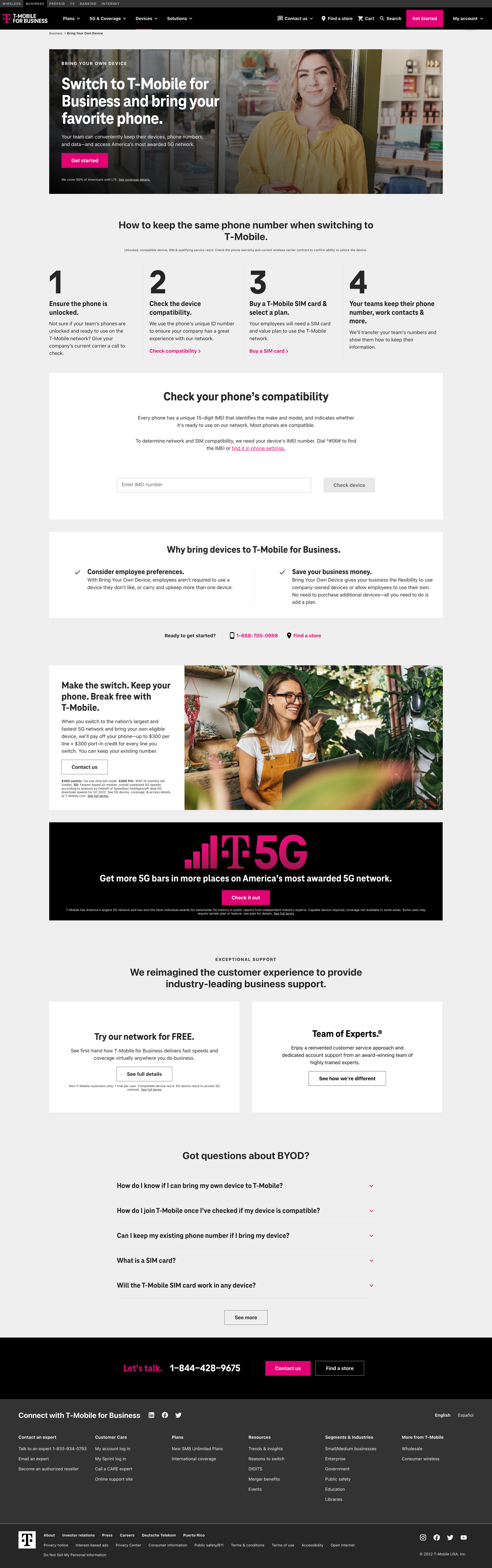 The new iteration of Bring Your Own Device landing page gives the end user all the information they need to bring their phone to T-Mobile. Upon arriving at the page, the user is able to see an easy-to-digest list of steps to learn how they can switch their device to T-Mobile. The user no longer has to scroll to the bottom of the page to dig for the answers they need. Instead, they are immediately guided to the first step in the process, which is checking their phone’s compatibility. All of this information is provided in simple language, which helps to build the user’s confidence in using this self-serve function.